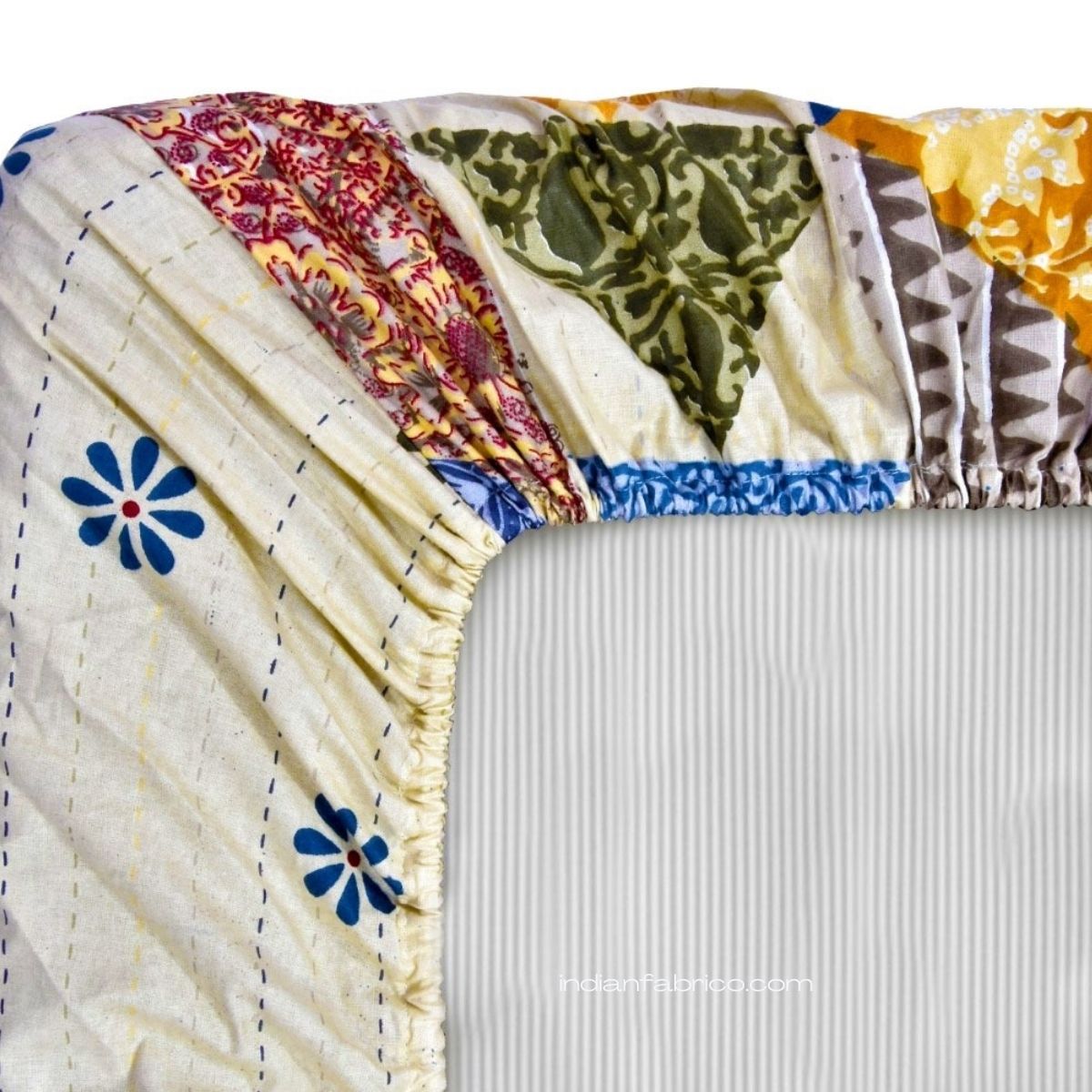 Barmeri Print Triangle Shape King Size Fitted Bedsheet Back Published July 23, 2021 at 1200 × 1200 in Jaipuri White Base Blue Jaal Gold Printed King Size Bedsheet with Two Pillow Cover ← PreviousNext →