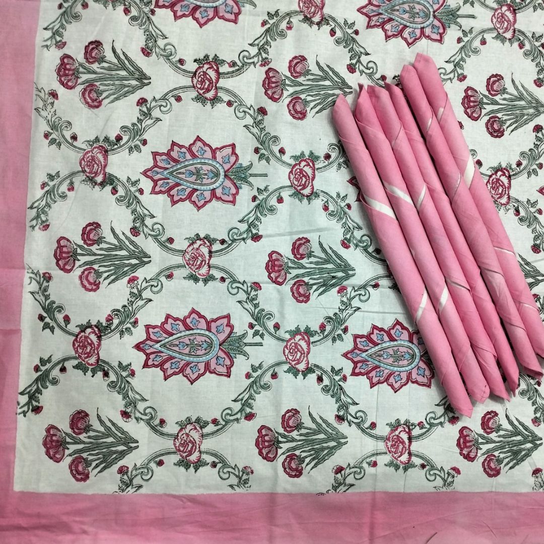 Dinning Table Cover Set – Pink Floral Jaal Print 6 Seater Set